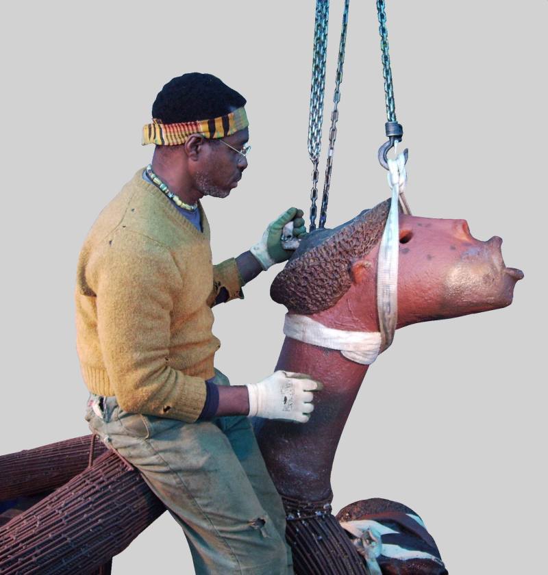 Als het middendeel op zijn plaats zit, monteert Salustiano de keramieke kop, voorstellende een man met de ogen en mond open, klaar om de wereld in te gaan.